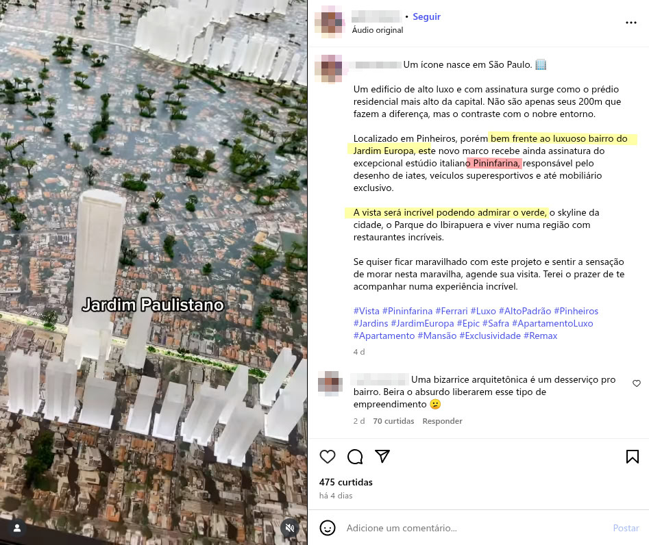 A histeria, afinal, não é urbanística, é estética e ideológica. É cansativo se deparar com mais uma dose de chilique em rede social para um empreendimento com assinatura da Pininfarina que é vizinho de uma imensa zona morta de mansões. É como se esse edifício se instalasse ao lado de certos condomínios da RMSP (Região Metropolitana de São Paulo) — com a diferença de que nenhum deles captura o marco regulatório de maneira tão perversa: ali no Jardim Europa, os muros estão na lei.